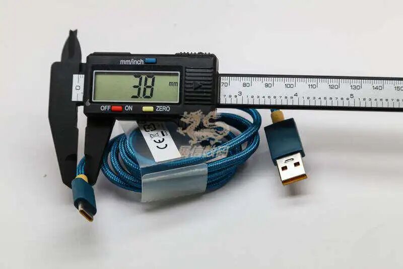 USB-A接口特写,这是OPPO特别定制的A头,内部使用黄色胶底,采用VCC和GND触点加宽型公头,以便支持5A以上大电流,里面还有一根特殊PIN脚,用于识别快充协议~