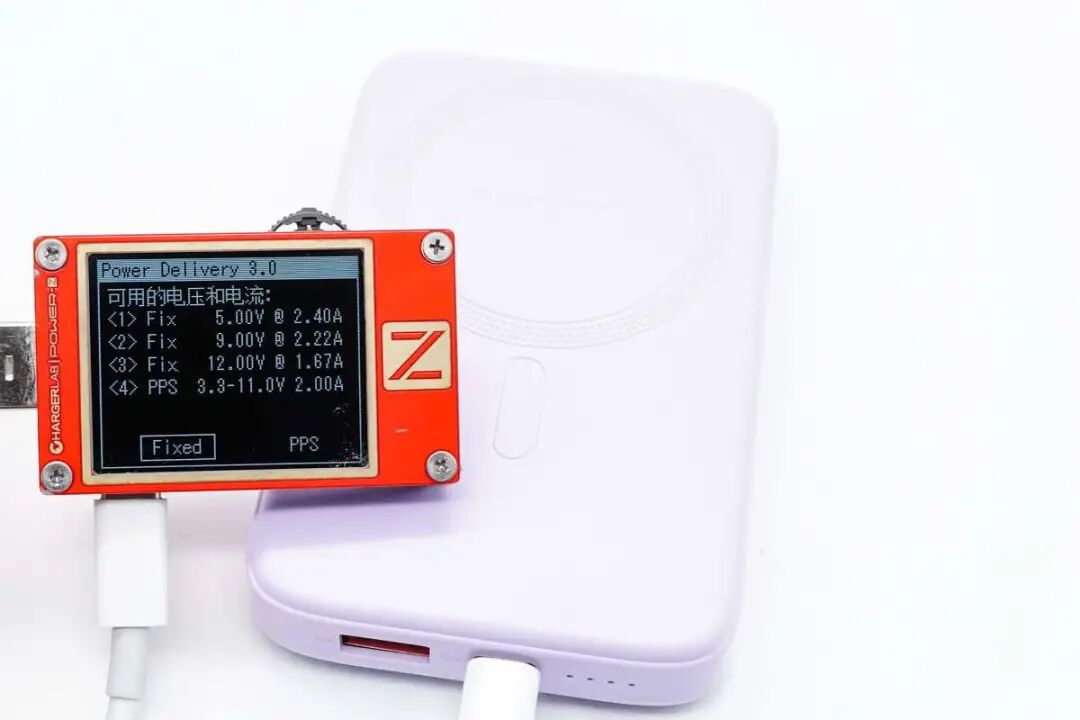 通过POWER-Z KT002 USB测试仪读取PDO报文发现,USB-C输出基于PD3.0标准开发,支持 5V2.4A、9V2.22A、12V1.67A 三组固定电压档,最大输出功率20W,另外还带有3.3V-11V2A 一组PPS电压子集。