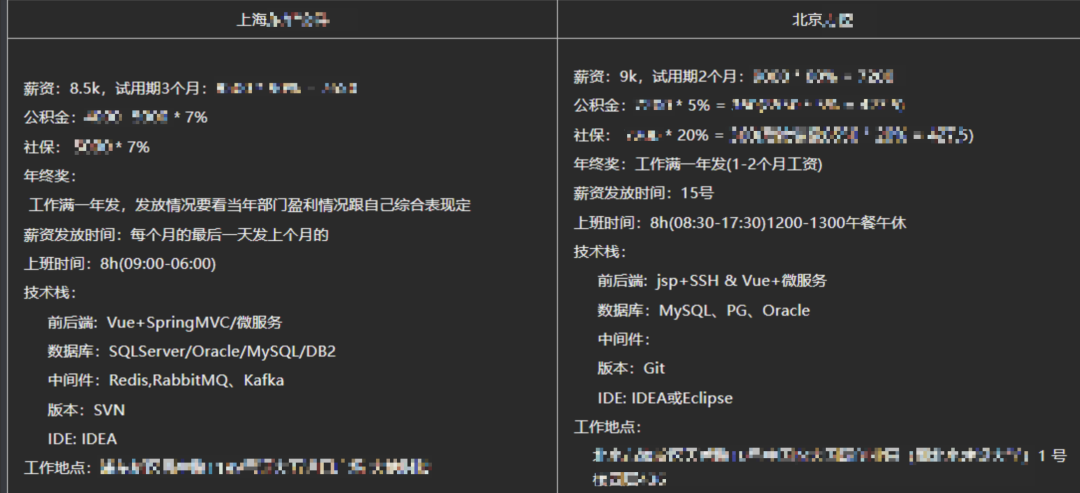 我现在收到了两个offer:一个是xx软件股份公司(在上海 给了8.5k),一个是北京yy科技有限公司(在北京 给了9k)。