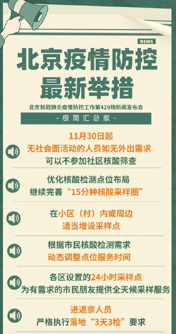 “自2022年11月30日起,对全市长期居家老人、居家办公和学习人员、婴幼儿等无社会面活动的人员,如果无外出需求,可以不参加社区核酸筛查。核酸检测“愿检尽检”,鼓励大家自备抗原,检测抗原。