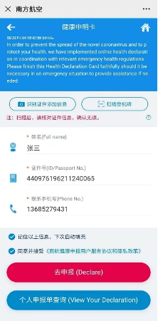 In addition, besides by scanning above QR Code to apply Entry Declaration, passengers could also search by our WeChat Official Account “中国南方航空”, input “深圳入境”, then click on pop-up link to fill the Entry Declaration. For passengers who bought tickets from APP or Website will accept the notice regarding Entry Declaration by WeChat Official Account or Text Messages, click on the link and fill the Entry Declaration ( https://m.csair.com/extra_book/infectPrevent/#/?channel=KWEDF2 ).