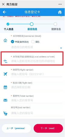 4.点击下一步填写航班信息,注意此处目的地详细地址需填写旅客在国内详细居住地,广东省深圳市、深圳宝安区、深圳xx隔离酒店均不合要求。