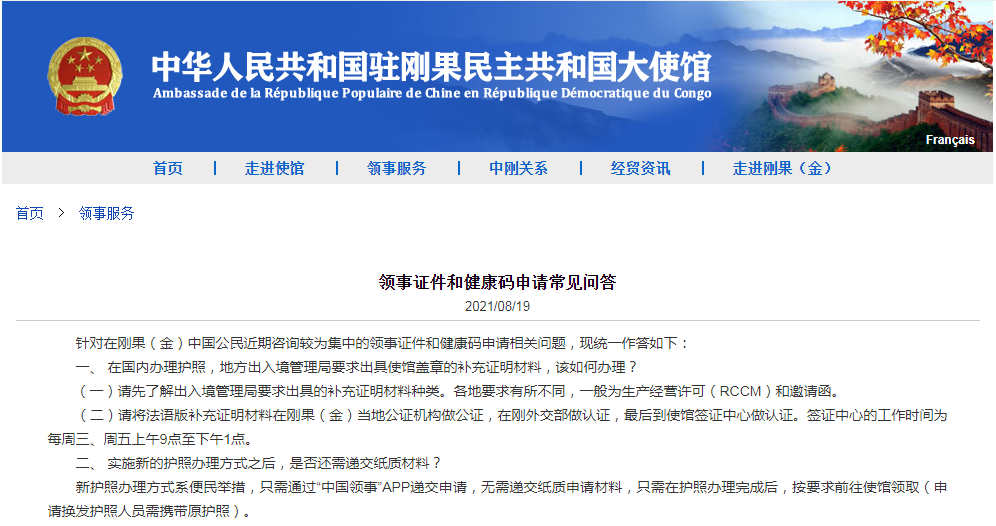 近日,针对在刚果(金)中国公民近期咨询较为集中的领事证件和健康码申请相关问题,使馆给予集中回应。
