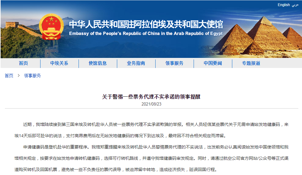 近期,中国驻埃及大使馆陆续接到第三国来埃及转机赴华人员被一些票务代理不实承诺欺骗的举报。
