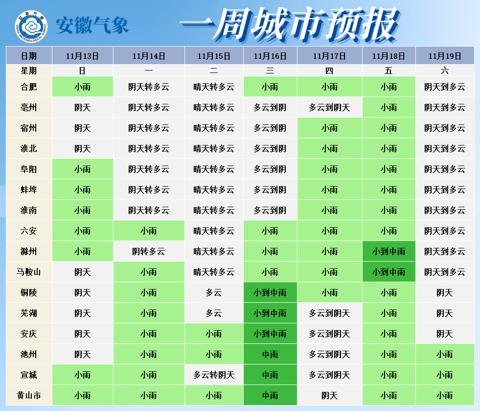 13日(周日):全省阴天,淮北地区南部和淮河以南大部分地区有小雨。