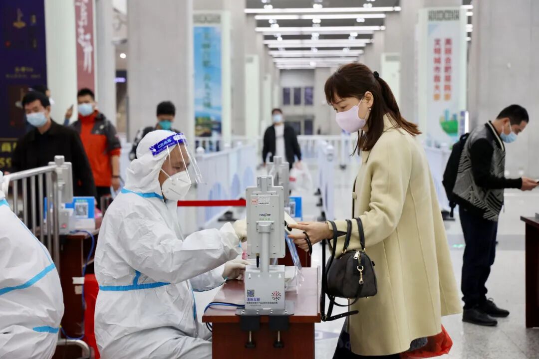 11月20日,在合肥南站出站口,工作人员通过全息防疫核验哨兵核验旅客“两码”,提高通行效率。全媒体记者 李予 摄