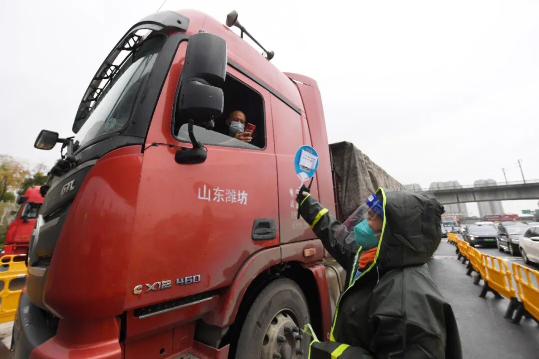 11月22日,在包河大道高速道口,工作人员在对货车司机进行“两码”核验。全媒体记者 郭如琦 摄