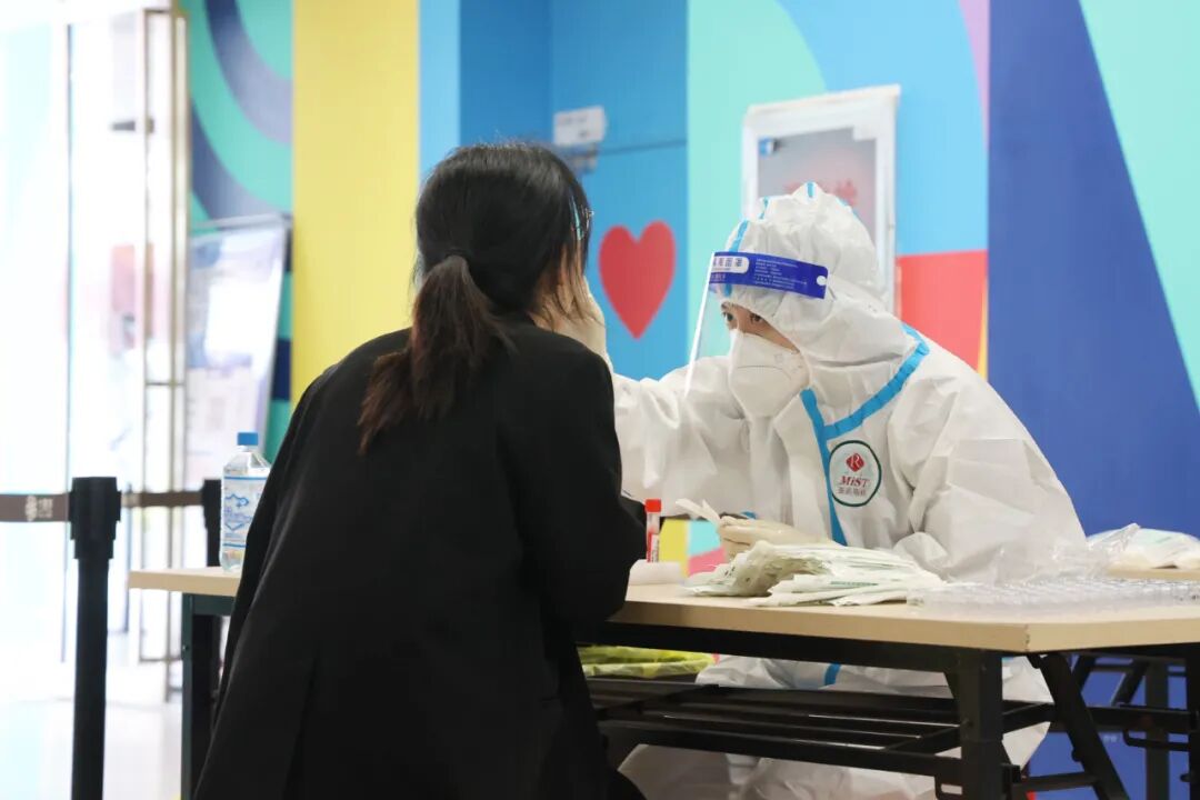 在包河区常青街道薛河湾社区一核酸采样点,工作人员正在为居民进行核酸采样。全媒体记者 李予 摄