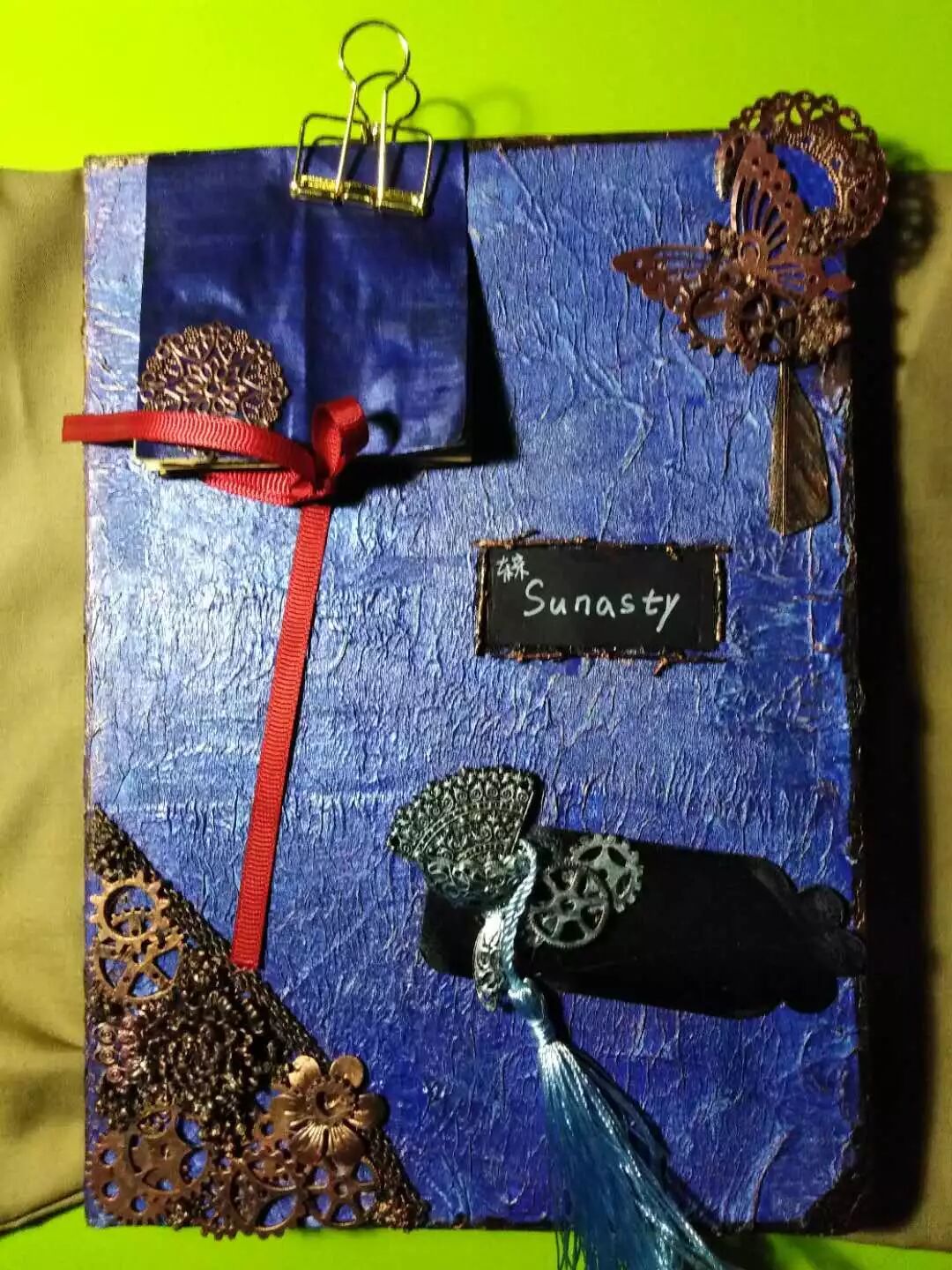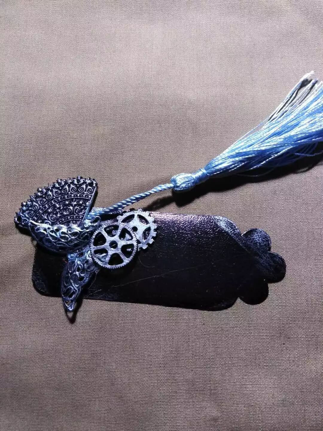 完成了蓝紫蓝紫的打底,接下来的东西就简单了很多。把所有用到的花片齿轮,链条麻绳挑出来重新上色,先用黑色的颜料全部涂黑,干掉后再用松散的散粉刷沾着红铜色和金色的颜料扫在花片上,保证颜色统一的同时营造金属感。