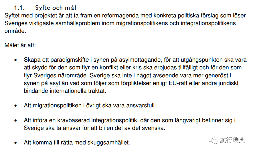 关于移民政策的调查项目,其目的是制定具有具体政治建议的改革议程,以解决瑞典在移民和融合政策领域最重要的社会问题。特别是在接受难民与庇护的观点上创造一个范式转变,其基准原则应该是为那些逃离冲突或危机的人提供临时保护。瑞典在庇护方面的任何政策都不应比欧盟法律或其他具有法律约束力的国际条约所规定的义务更为慷慨。