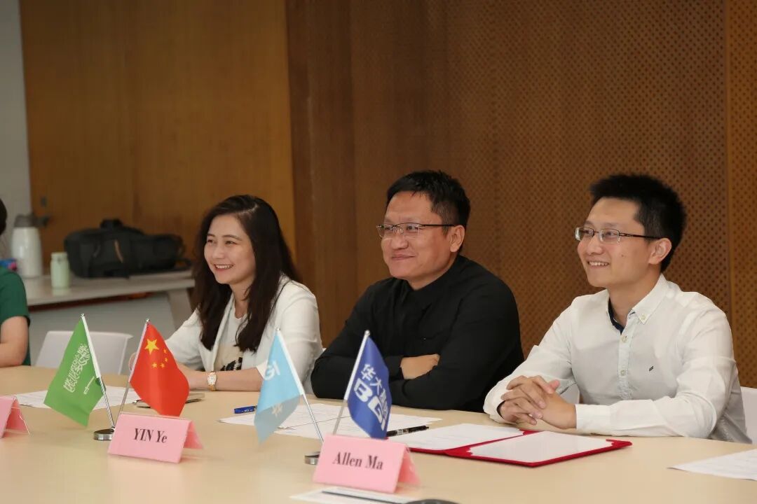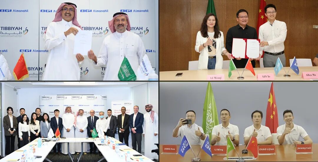 Al Faisaliah集团首席执行官Mr. Ziad Al Tunisi、Tibbiyah首席执行官Mr. Alaa Ahmed Ameen、华大基因中东北非区产品负责人徐辉、中东北非区销售负责人黄镜成、中东北非项目中心行政及2C业务负责人肖若、中东北非区物流负责人李文宇等人在沙特会场出席签约仪式。