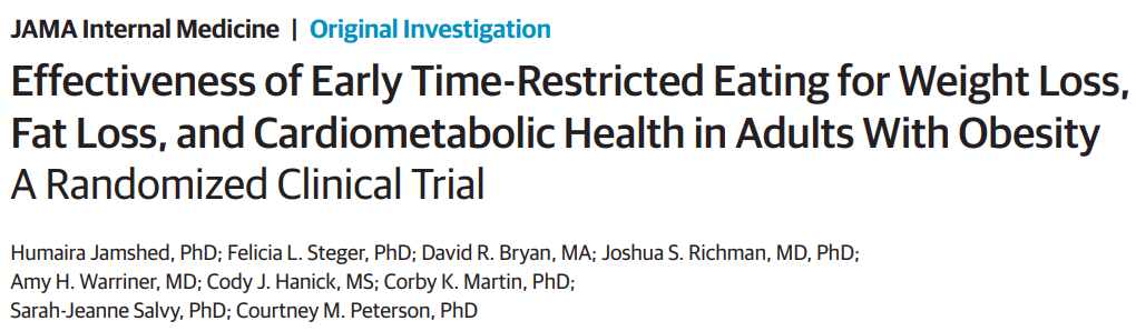 [1].Jamshed H, Steger FL, Bryan DR, et al. Effectiveness of Early Time-Restricted Eating for Weight Loss, Fat Loss, and Cardiometabolic Health in Adults With Obesity: A Randomized Clinical Trial [published online ahead of print, 2022 Aug 8]. JAMA Intern Med. 2022;10.1001/jamainternmed.2022.3050.doi:10.1001/jamainternmed.2022.3050