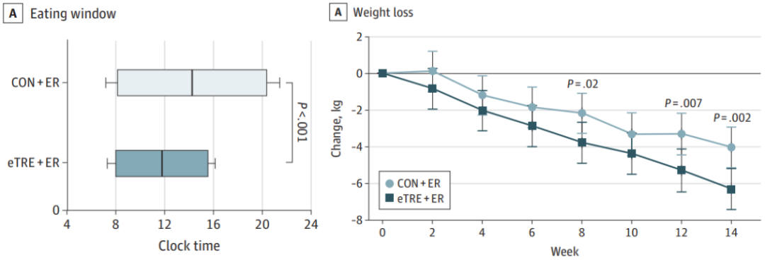 坚持14周之后的结果显示,在限制饮食热量的前提下,两组参与者的体重都有了显著下降。eTRF组的参与者体重下降了6.3kg(p<0.001),而对照组下降了4.0kg(p<0.001),前者比后者的下降更明显!