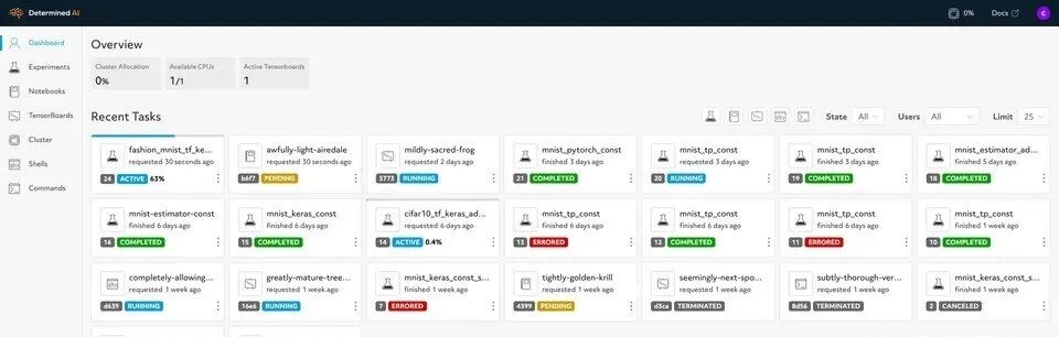 Determined是一家国外创业公司做的集群管理+可视化作业+模型调优一体的解决方案,当然这里我选择它的原因主要还是集群管理。从2019年开始我就在各处找合适的方案,期间也用过微软的OpenPAI,基本能够满足上述的1,2,4,5。但是难受就难受在环境依赖一大堆,科学上网只要不稳,升个级要费上好几天。手动改了一些shell脚本替换成国内源,但是更新了几个大版本要跟着改,实验室就我一个人会升级,就很难顶。