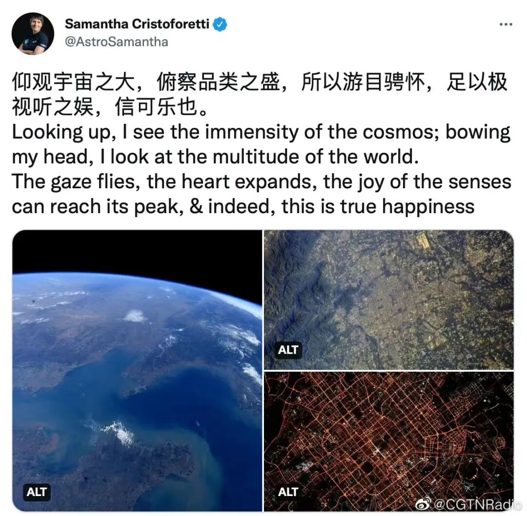近日,在国际空间站执行任务的意大利女航天员萨曼萨·克里斯托福雷蒂在社交媒体上发布了一组太空摄影作品,并配上了中国著名书法家王羲之所著《兰亭集序》中一句描绘宇宙景观的古文——“仰观宇宙之大,俯察品类之盛,所以游目骋怀,足以极视听之娱,信可乐也”。此举引发国内外网友热议。