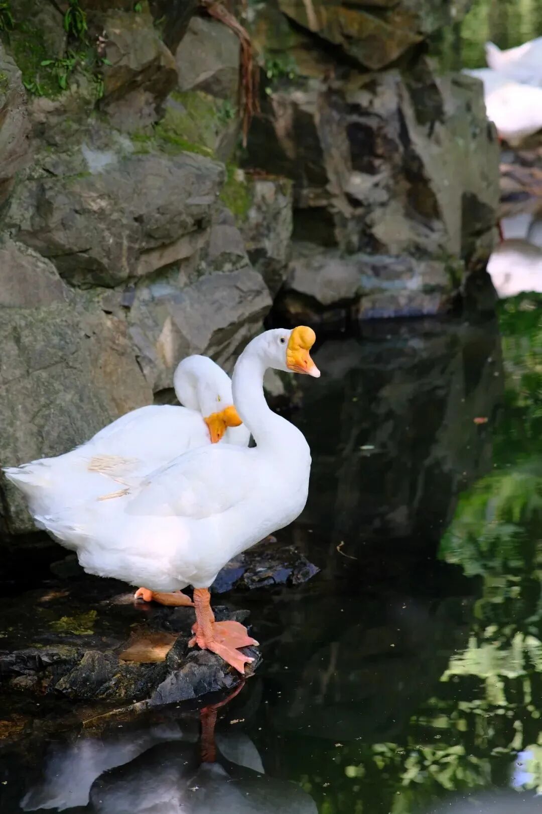 兰亭以曲水流觞为中心,环绕着流觞亭、鹅池亭等,流觞亭即为《兰亭集序》的完成地,现在成了仿古活动的聚集地。鹅池亭前的石碑相传“鹅”字为王羲之亲手提笔,“池”字则为王献之补写,父子共同写下这一石碑成了一段佳话。