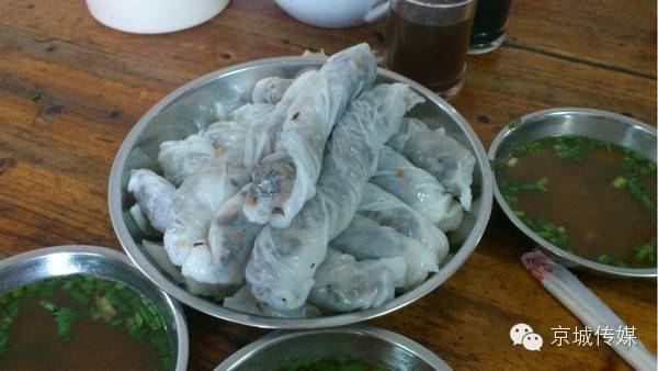 细腻润滑的米粉上,再用一条细细的竹子一卷;一条晶莹透亮,热气腾腾的卷粉就到了你的面前,你的面前早已有了一碟肉未上汤,你可以把卷粉放到汤碟上慢慢享用,你能吃醋的话,也可以加醋;一般每人能吃五条吧,很便宜的。