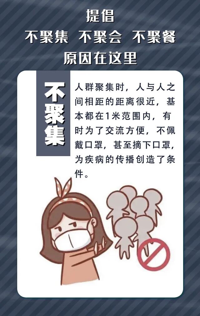 尽量避免前往人员密集场所,前往公共场所时遵循“限量、预约、错峰”的原则,不聚集、不扎堆,个人防护不可少,坚持全程佩戴口罩,保持安全社交距离,并注意个人卫生。