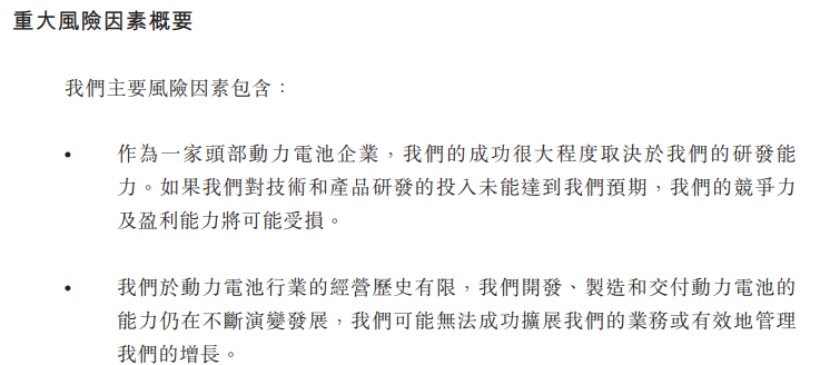 第一,作为一家头部动力电池企业,成功很大程度取决于研发能力。如果对技术和产品研发的投入未能达到我们预期,竞争力及盈利能力将可能受损。