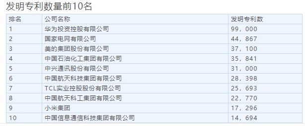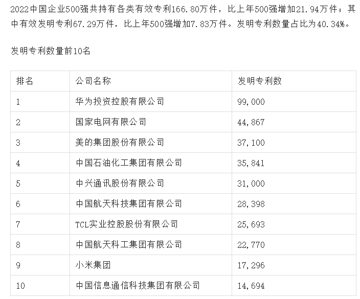 2022中国企业500强发明专利数量前10,如下图。![]()