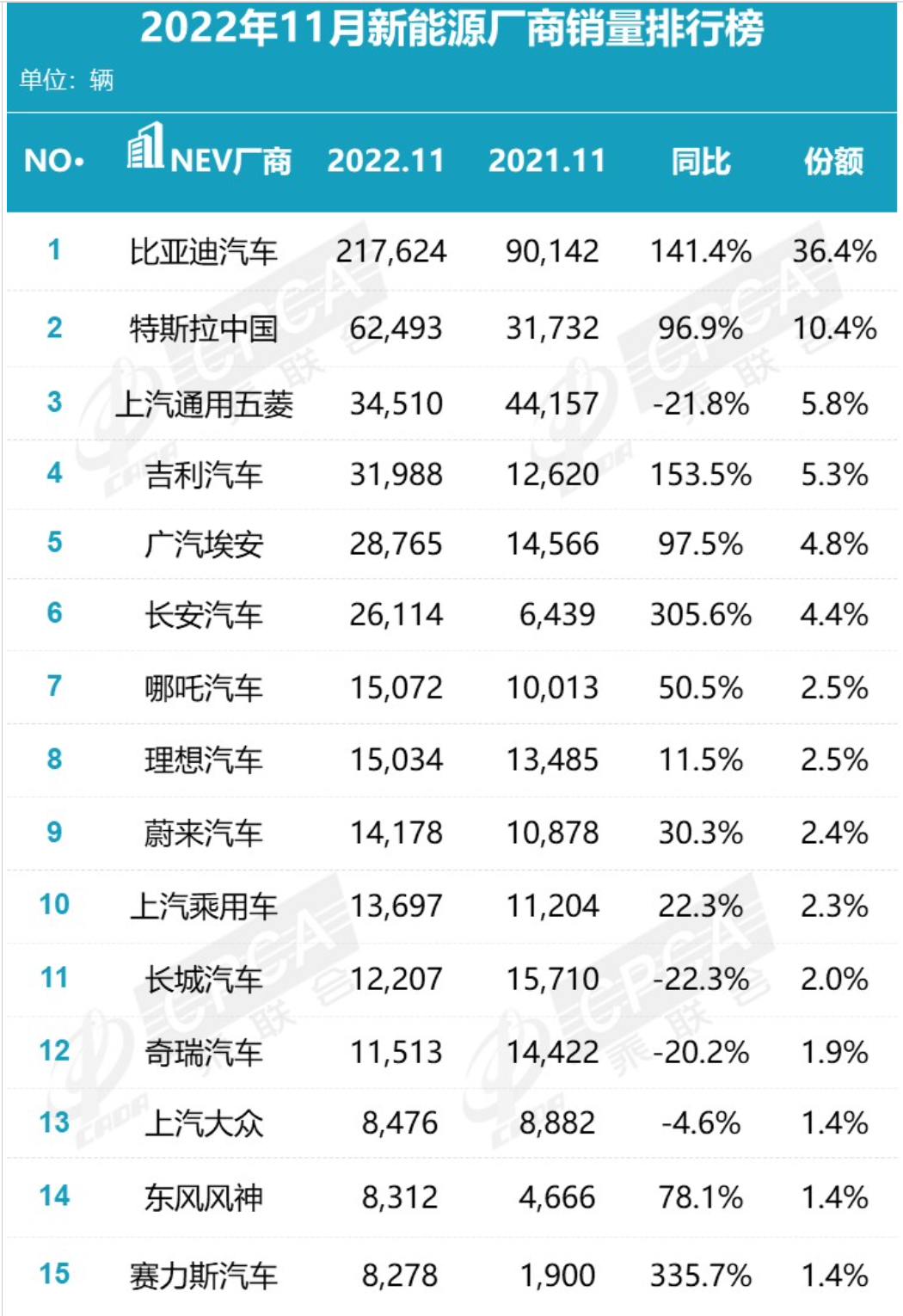 图表来源|乘联会(特此感谢)10月,同比负增长的车企还是3家,分别是上汽通用五菱、长城汽车、上汽乘用车。11月多了一家奇瑞汽车。当然,不管怎么说,杠杆游戏觉得难兄难弟再多,自己连前15大名单都进不了,这才是最悲催的。还算不错,好歹前11月总销量,小鹏汽车还在新能源车企的前15,11位,还算不错。