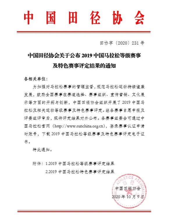 10月9日,中国田径协会在官网正式公布了2019年中国马拉松及相关运动等级赛事及特色赛事评定结果。经过审定,中国田径协会共评选出274个标牌赛事,其中金牌赛事118个,银牌赛事74个,铜牌赛事82个。此外,有93场赛事获得特色赛事荣誉。