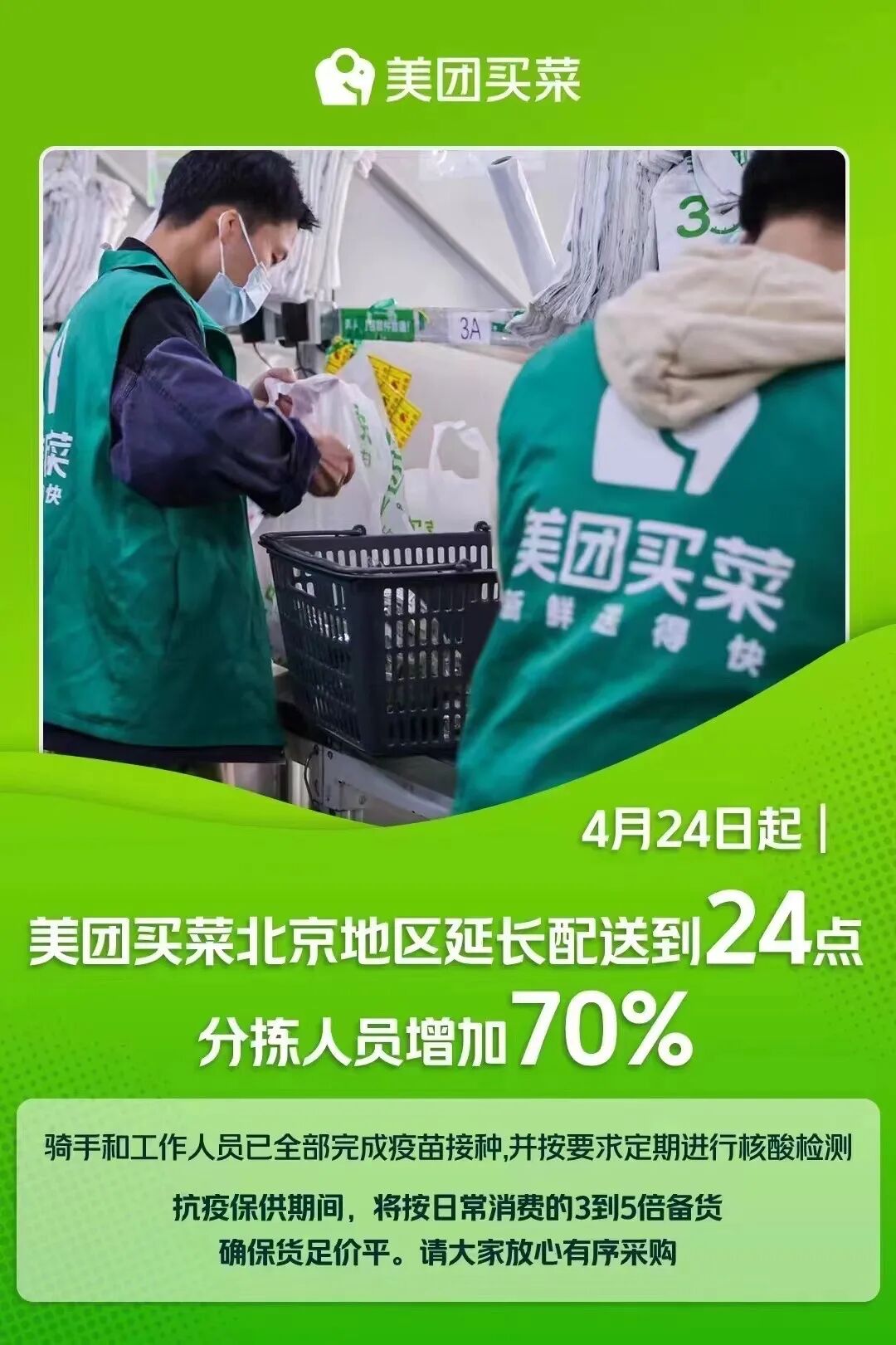 美团买菜表示,从4月24日起,北京地区订单配送时间将延长至24点,除个别积压站点以外,将尽可能保证订单完成当日配送。针对肉禽蛋奶以及新鲜果蔬等市民采购量比较大的商品,美团买菜第一时间加大了相关商品库存,抗疫保供期间,将按日常消费的三到五倍左右进行备货,确保相关商品的库存充足,价格稳定。同时,实时追加人员全力保供,目前一线分拣人员增加70%,配送人员增加50%,以确保用户及时收到货品。
