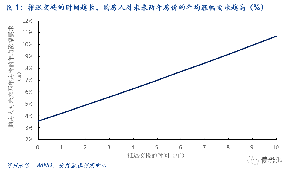 以此类推,推迟交楼的时间越长,购房人对未来两年房价的年均涨幅要求越高。
