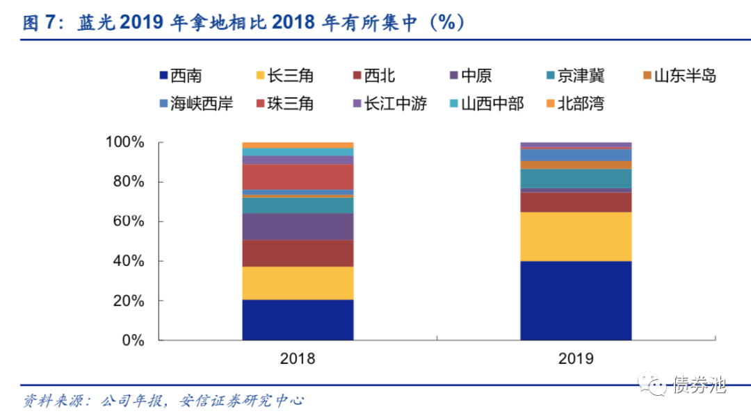 2019年公司加杠杆放缓,融资成本上行。3-8月发行小公募25亿元、中票9亿元、短融6亿元、美元债7.5亿美元,11-12月发行私募债7亿元。境内发债期限和利率基本在3年7.5%左右。年内部分债券到达回售期,公司大幅上调票面利率。8月“16蓝光01” 票面利率从5.5%上调到7.4%,回售金额仍达到23.8亿元,完成转售6.88亿元;10月“16蓝光02” 票面利率从5.25%上调到7.6%,回售金额10亿元,转售0.0亿元。总体看2019年公司加杠杆明显放缓,全年有息负债增38.1亿元,同比增速相比2018年大幅下降56.0pct;全年综合融资成本8.65%,相比2018年上升111.0bp。