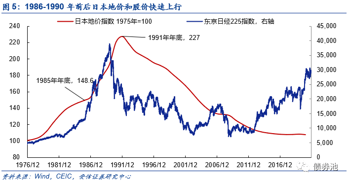在持续的宽信用宽货币宽财政政策组合之下,日本资产价格快速上升。1986年至1991年,日本平均土地价格上涨幅度达到了52.8%。同期日经225指数也自1985年年底的13000点附近上涨至1989年底的峰值39000点附近,累计上涨幅度接近200%。