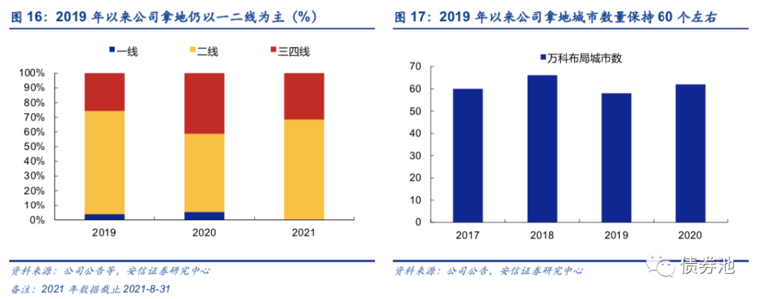 从拿地端来看,2019年以来公司拿地节奏较为平稳,2019年、2020年、2021年上半年拿地强度为36.8%、32.1%、31.8%,拿地仍然以一二线城市为主,建面占比在60%-70%左右。2019年以来拿地城市数量保持在60个左右。