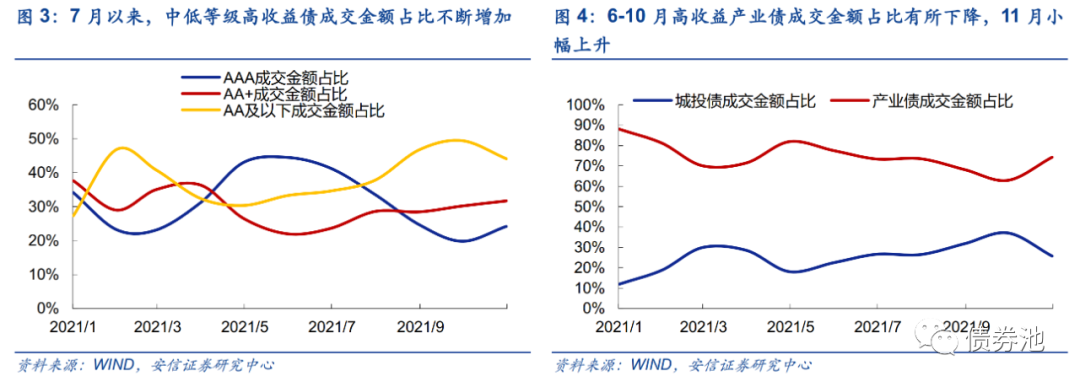 从主体评级来看,以低等级为主。2021年1-11月,AA及以下高收益债成交金额为2200.6亿,占比为38.4%,AAA、AA+成交金额分别为1794.2亿、1713.8亿。7月以来,中低等级高收益债成交金额占比不断增加,高等级则不断下降。