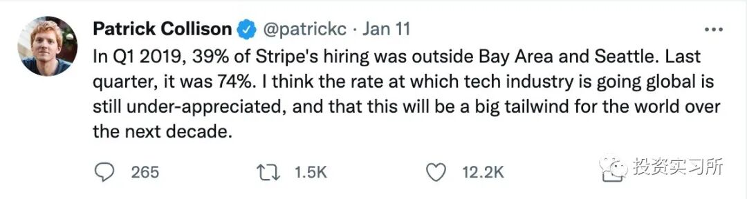 2019 年第一季度,Stripe 公司 39% 的招聘来自旧金山湾区和西雅图之外。上个季度,这个比例是74% 。我认为科技产业全球化的速度仍然没有得到足够的重视,这将是未来十年世界经济的一大助推器。