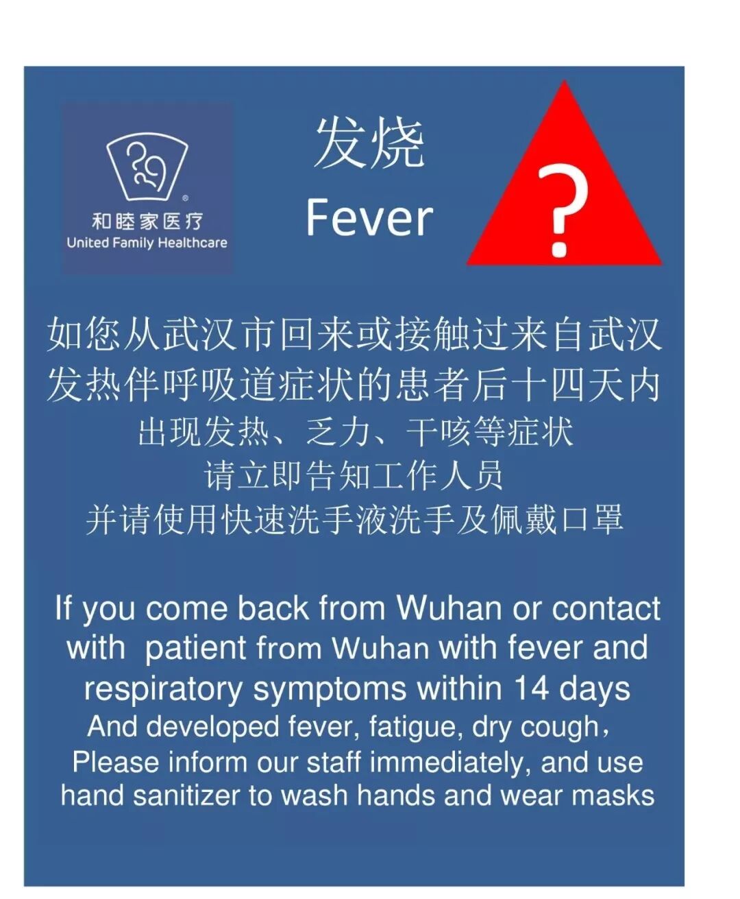 - Nuchal Translucency (NT) test during 11-14 weeks of gestation - Ultrasound during 20-24 weeks of gestation - Oral Glucose Tolerance Test (OGTT) during 24-28 weeks of gestation - Any other ultrasound or tests as per doctors’ medical advice after 36-37 weeks of gestation It may be acceptable to reduce the frequency of visits to the hospital during pregnancy, but make sure you discuss with your doctors first before you make a decision. If you are unsure whether you should keep your appointment, it’s best to contact your OB/GYN to confirm. Please note, in order to further improve infection control and reduce the risk of spreading the novel coronavirus infection in the Hospital, Beijing United Family Hospital has temporarily suspended the WeChat and online appointment channels. During this period, if you have any medical needs, please call our 24hr Service Center at 4008-919191.When you come to the hospital, make sure you wear a mask and limit your time of staying in the hospital as much as possible. If you have to wait for procedures or tests, consider staying in an open area rather than indoors. 3. Protect yourself and your childIf you are pregnant or breastfeeding, and have a fever, cough, nausea, vomiting, abdominal pain, or diarrhea, monitor your body temperature regularly, and keep a record. Do not self-administer medications without professional medical advice. Speak to your OB/GYN for information on how to safely take medications. Seek medical help immediately if your newborn’s lips appear purple, has diarrhea, or difficulty breathing. With the current known knowledge about the 2019-nCoV epidemic, the mode of transmission among children is likely droplets and touching. Children are a vulnerable group, especially young children. However, mothers should stay calm as preventative measures are so far the most well-known measures to slow down the spread of the virus. Other suggestions for a mother to protect other children at home are the following: 1) Stay away from the child if any family member has confirmed or suspected 2019-nCoV infection; both mother and child should wear a mask. Choose child-appropriate masks for children, however, it’s unsafe for infants (<1 year old) to wear masks. 2) Practice general hygiene - parents should wear masks to protect infants who are not suitable to wear masks. Cough or sneeze into a tissue or your elbow, and discard the tissue into a closed bin, then wash your hands with running water and soap. Avoid kissing the child, breathing directly towards the child, feeding the child, or sharing eating utensils or cups. 3) Practice hand hygiene at all times. Ask the child to wash his/her hands and avoid touching surfaces or objects in public areas. Avoid picking the nose with fingers, sucking on fingers, rubbing eyes, or touching surfaces in public areas (e.g., elevator buttons). Wash hands before eating and after going to the toilet. Teach children how to wash their hands properly by following the steps in the picture below. 4) Keep the rooms well ventilated. Open a window for 30 minutes to one hour, 2-3 times a day. Keep the children warm while windows are open. 5) Clean and disinfect the household areas using household disinfectants. Avoid children playing with your phone. Clean the phone, iPad, or other toys. Clean toys in boiling water for 30 minutes if possible, otherwise spray it with an alcohol-based disinfectant and place under the sun. Use a disinfectant to mop the floor 1-2 times a day.6) Play sensibly and rest well. Avoid watching TV or playing video games for a prolonged period. Exercise if possible. Encourage children to take part in household chores and get the recommended amount of sleep. 4. Pregnant women expecting to give birth within the next few months should be more careful.With preventative measures taken at every step leading to giving birth, the risk of contracting a viral infection should be limited. It’s essential to strictly follow the preventative measures. ![]()