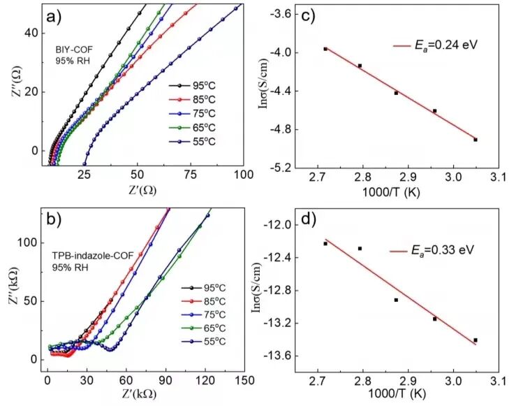图3 质子电导率测量。不同温度(95% RH)下(a)BIY-COF和(b)TPB-indazole-COF的Nyquist 图。(c)BIY-COF和(d)TPB-indazole-COF的Arrhenius图。
