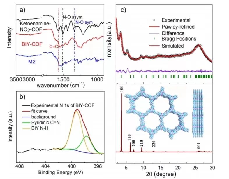 图2 (a)BIY-COF、Ketoenimine-NO2-COF和模型化合物M2的FT-IR谱图。(b)BIY-COF的XPS光谱。(c)BIY-COF的实验和模拟PXRD谱图,以及Pawley精修和差谱。
