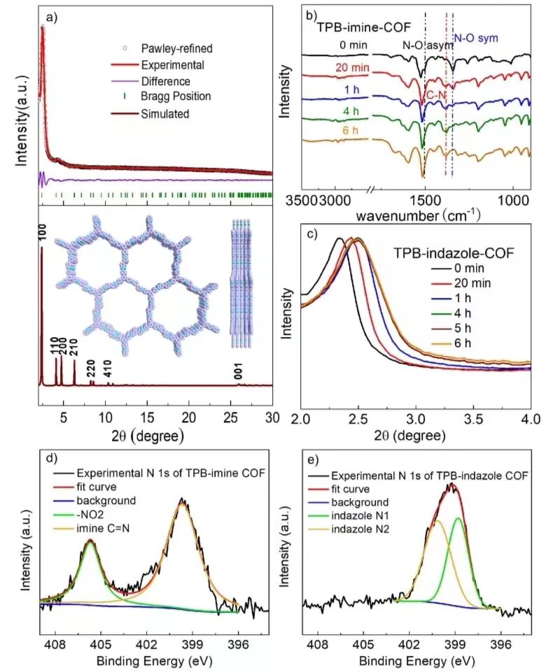 图1 (a)实验和模拟TPB-indazole-COF的PXRD谱图,以及Pawley精修谱图和差谱。TPB-imine-COF还原时TPB-imine-COF的(b)FT-IR和(c)PXRD图谱的变化。(d)TPB-imine-COF和(e)TPB-indazole-COF的XPS光谱。
