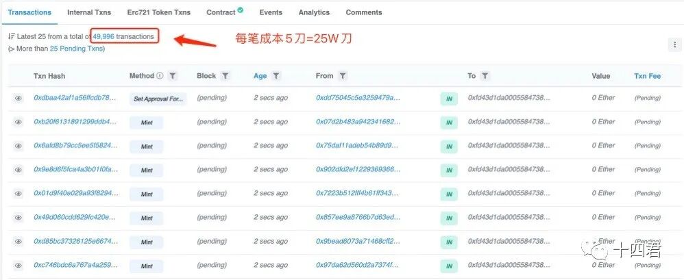 由于此nft获取的代价太低,基本平均在当前20wei的gas成本下,截止5.20- 9点 已经有5W 次交易,大多数是mint的操作。当然出了bug后,基本后续此nft的价格不会太高,大家也就相当于参与体验玩玩