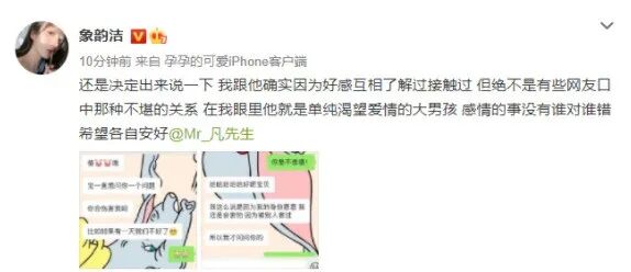 否认过两个人关系的象韵洁也一改此前的态度,不仅承认了曾经和吴亦凡因好感互相了解接触过,还夸赞他是个单纯渴望爱情的大男孩。