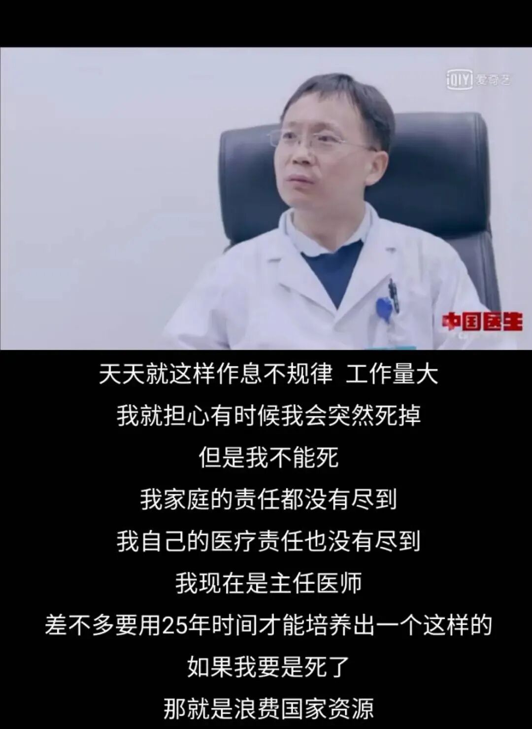 疫情期间,纪录片《中国医生》伴随着网络平台的播出迅速走红,纪录片中,河南省人民医院国家高级卒中中心主任医师朱良付一段话打动了很多人,天性乐观、每天骑着小电驴往返于家和医院间的朱良付半是无奈半是心酸地说起医生这个职业:“天天就这样作息不规律,工作量大,我就担心有时候我会突然死掉。但是我不能死,就我家庭的责任我都没有尽到,我自己的医疗责任也没有尽到。我现在是主任医师,我们差不多得要25年的时间,才有可能培养出来一个这样的(医生),我现在要是死了,那就是浪费国家资源。”