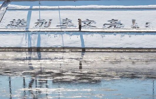 2020年2月7日,北京通惠河边,有人在雪地里写下了“送别李文亮”五个大字。图 / 中新社