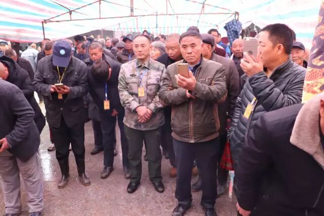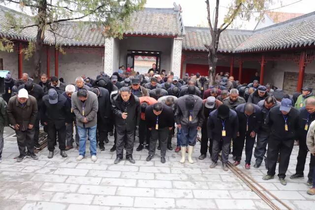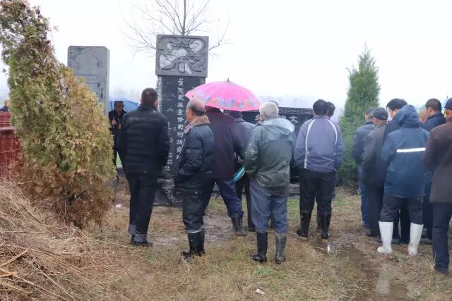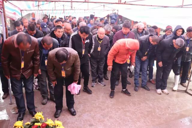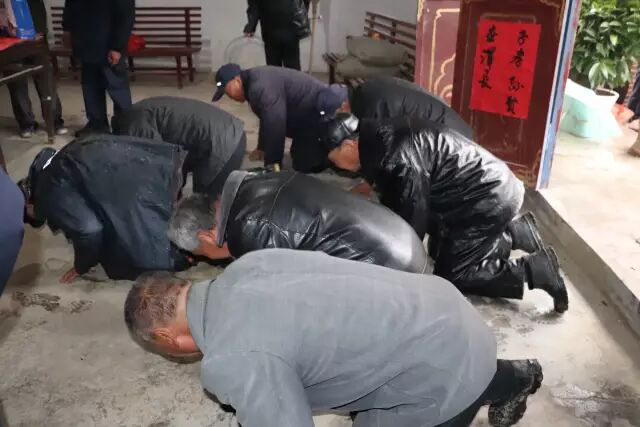 由于天气原因,不能跪拜,宗亲们虔诚的三叩首。