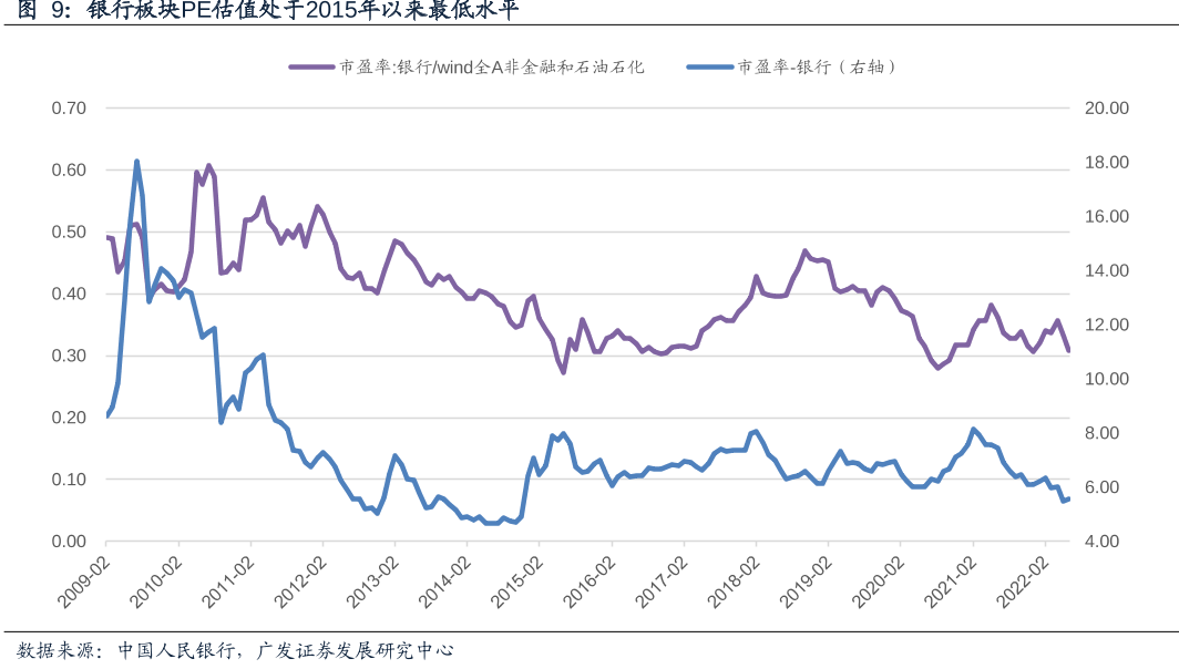 去年6月以来,板块先后经历了房企暴雷、上海疫情、金融反腐的冲击,银行指数估值持续下行,当前板块估值水平也处于历史低位。