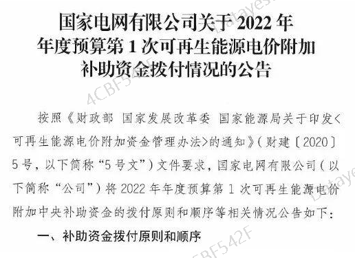 国家电网消息,2022年度预算第1次请款,财政部共预计拨付公司可再生能源电价附加补助资金年度预算399 .37亿元,其中:风力发电105.18亿元、太阳能发电 260.67亿元、生物质能发电33.51亿元。