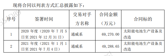 20年7月5日到21年7月4日一整年期间,迈为股份子公司与通威股份的很多控制公司也签署了多份日常经营合同,累计金额11.86万元,这占2020年度审计主营收的51.88%。