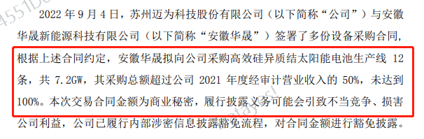 大概内容是:安徽华晟拟从迈为股份采购高效硅HJT电池生产线12条,产能共7.2GW。这个采购总额超过了公司去年年度审计营收的50%。去年年报显示,迈为股份全年营收为30.95亿元,也就是说此次订单金额超过15亿元。