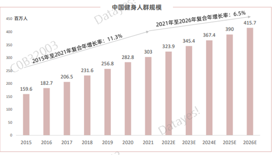 2021年,我国为全球健身人群最多的国家,达到3.03亿人,预计到2026年将达到4.16亿人,期间复合年增长率将达到6.5%,为美国及欧洲的近两倍。