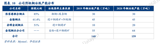 ,公司2019年旗下拥有4家冶炼厂,三家冶炼控股子公司,一家冶炼分公司,合计精炼产能140万吨,到了2020年就增长到159万吨。