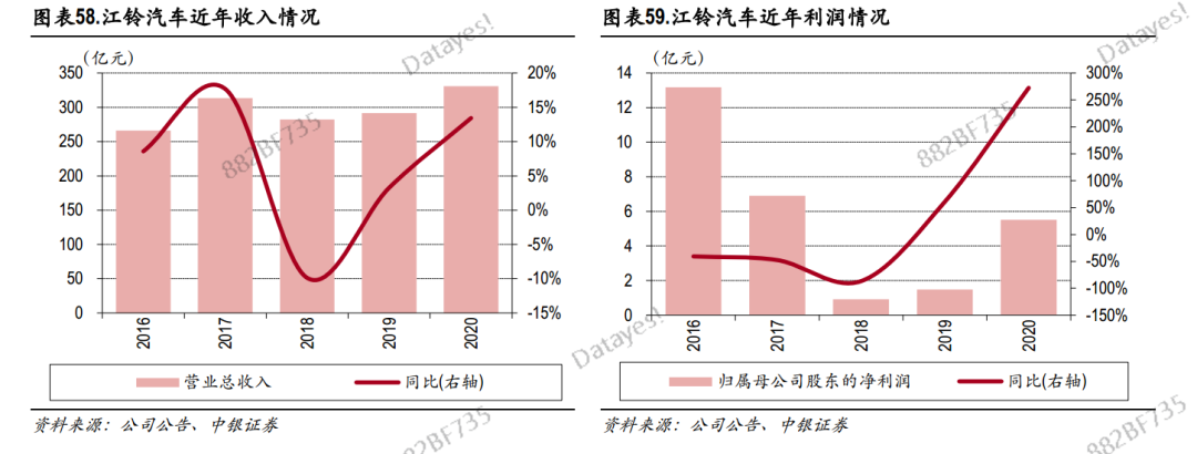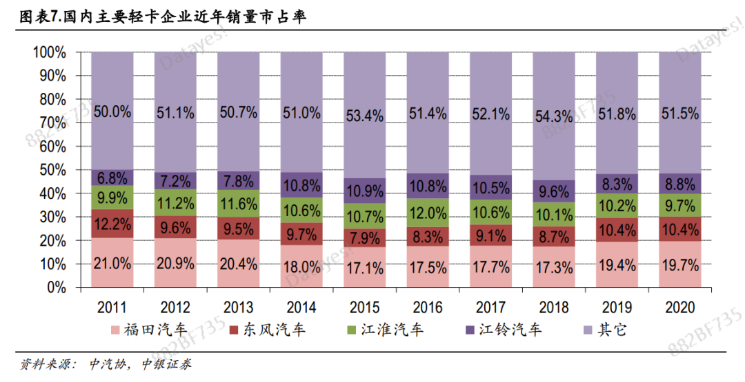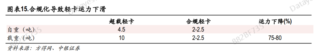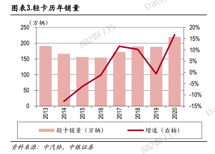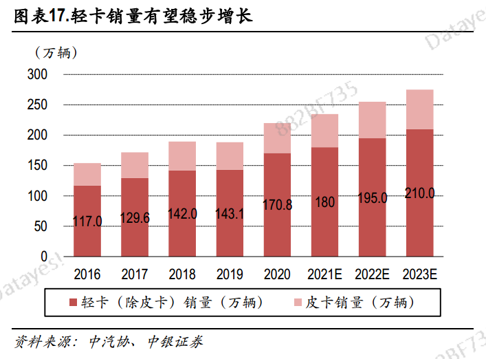 但接下来,萝卜君认为,多重因素将影响轻卡的销售量迎来回升期。轻卡是国内销量及保有量最高的货车种类,其指在公路上运行的最大总质量在1.8吨至6吨之间的卸货汽车,路程在500公里以内。2017年以来,伴随着经济发展、城市化以及物流行业的拉动,轻卡销量处于较快的增长期。2020年,轻卡的销量达到220万辆,同比上一年增长了16.8%。轻卡的动力主要来自柴油和汽油,其中柴油车占比为70%左右,汽油车占比为30%左右。因为这些燃料会形成尾气污染,所以其受排放标准的约束。在此约束下,轻卡的销售结构朝向着高端化发展,进入的门槛和集中度也在逐渐提高。其中北汽福田汽车、东风汽车、江淮汽车、江铃汽车四家是轻卡市场的主力,市占率在50%左右。福田汽车是中国品种全、规模大的商用车企业,生产车型涵盖轻型卡车、中型卡车、重型卡车、轻型客车、大中型客车以及核心零部件发动机。2020年公司销售汽车68.0万辆,同比增长26.0%,其中轻卡市占率19.7%,位列国内第一。而且,2019年,公司轻卡收入占比约为53%,收入排名第一。今年上半年,公司实现营收319.3亿元,同比增长17.3%,实现归母净利润6.1亿元,同比增长238.8%。江铃汽车是国内中高端轻型商用车领军者,其是福特中国战略中的轻型商用车生产基地,福特支持一直是公司增长动力。2020 年公司销售汽车33.1万辆,同比增长14.1%,其中轻卡销量多年位于国内前四,市场地位稳固。东风汽车主营业务为全系列轻型商用车整车和动力总成的设计、制造和销售。销量方面,主要由轻卡组成,其占比由68%逐步上升至87%。2020年公司销售汽车17.3万辆,其中轻卡15.0万辆,市场占有率6.8%。业绩方面,公司营收与净利润2018年受剥离郑州日产的影响大幅下滑,近2年相对稳定。江淮汽车是一家综合型汽车厂商,公司产品主要是整车和客车底盘。销量方面, 轻卡占比由 28%逐步上升至47%,2020年公司轻卡市场占有率9.7%,位列国内第四。而且,今年3月,公司公告称与蔚来签署协定,双方共同出资建立新公司,蔚来汽车发展蒸蒸日上,而江淮与蔚来合作更加紧密,未来有望持续受益。此外,值得一提的是,除了这些传统的轻卡企业外,原有的重卡龙头企业也在纷纷在轻卡领域发力,这里的中国重汽、一汽集团都在这方面取得了较好的效果。总得来说,作为市场销售及保有量最高的车型,该市场的供给格局还是相对稳定的。行业除了对碳排放有标准,还对车型的载重有一定的要求,这要从“大吨小标”说起。所谓的“大吨小标”是指这种车型所规定的车货总质量标准很小,但实际上该车型的车货总质量大大的超过了那个标准。例如,按照规定,轻卡的车厢长度在4.2米以内时,车货总质量不超过4.5吨,这样可以悬挂蓝牌,有路权优势,c照就可以驾驶。而整车厂为了提升蓝牌轻卡的载重量,加大马力、加厚大梁、加固车型,使得多数蓝牌仅整车的质量就接近4.5吨,甚至超过4.5吨,在空车就面临超载的情况下,其还要拉10吨以上的货物,这属于严重的违规。为了整治这种现象,国家不断出台整治方案,从生产环节、维修改装环节、登记检验环节等多个环节进行政治。例如在生产环节,会要求总质量在4.5吨以下的蓝牌轻卡,其发动机排量不大于2.5L,货箱内部宽度不大于2.1米,这样,不符合该标准的蓝牌轻卡将无法获得合格证。同时,在运营环节,如果蓝牌1类轻卡超载会按照2类车的收费标准来收费,这样100公里费用将由40元上升至107元,运营成本会翻倍提升。类似这种的多项治理措施使得轻卡市场更加合规,车厂都向标准载重发展。按照这个方向发展,我们想一想,即使厂家将车自重降至2-2.5吨,这样一辆要求总质量为4.5吨的标准轻卡最多也就只能运载2.5吨货物。这对比“大吨小标”的10吨载重量,下降了75%,轻卡的运力大幅下降。这时,消费者可能会想着去用其他车型代替。因为蓝牌轻卡由于有路权、双证等优势,大部分均无法被中重卡替代,预计仅有20%的需求会转向中卡。同时,因为微卡的承载量要更小,轻卡一趟货微卡要分两次跑,工作强度加大。而且微卡一般使用汽油发动机,耗油比柴油机高,这样再跑两趟,运输成本更要高。所以,综合考虑,大多用户还是会选择购买合规的轻卡。长期来看,这将推动轻卡销量的增长,预计2023年其销量将达到 210万辆。前面,萝卜君也说到,为了改善空气质量,降低尾气对于空气的污染,我国的排放标准在不断升级。就在上月1号,国家要求对于轻卡车型从国五的标准升级到按照国六的标准去实施,国六标准与国五相比,对整体污染物排放的限制要求更加严格,其中CO等限制要减少30%-60%。还引入了美国车载诊断系统(OBD)要求。这对柴油机的排放标准越来越严格,较国五阶段,国六需要增加额外的尾气处理等装置,使得单车的成本增加约6000-10000元,而此时售价却一般提升1-2万元。这样,一方面,轻卡单价提升,有利于改善利润率。另一方面,国六排放的处理方案会涉及发动机、后处理等一系列环节,对于企业整体研发实力要求较高,没有核心技术整合能力的尾部企业有掉队的可能性,这样头部企业的竞争压力就会减小,利润率也有望提升。综合来看,相关企业将受益于轻卡的量价齐升。提醒大家,对于量,我们要注意“大吨小标”治理及合规化不及预期,轻卡销量不好的影响;对于价,我们要注意上游原材料价格变动以及竞争加剧对产品降价的影响。萝卜投研8·18粉丝嘉年华震