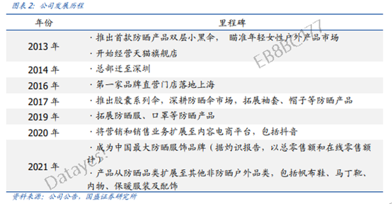 分品类来看:公司过去实现了品类的扩充,从2019年以伞具为主扩展至2021年的全系列防晒及轻户外用品。